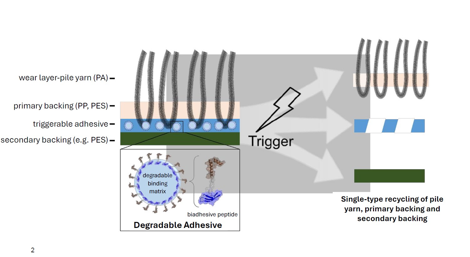 At DWI, a tailor-made peptide adhesive with strong bonding and stimuli-responsive properties was developed for removal. At TFI, the production technology for applying and drying the coating system was developed. Functional samples for benchmark comparisons were also developed here. Following the development of a separation and recycling concept, the coating system was evaluated in terms of its economic and ecological benefits. The transferability of the new coating system to needled textile floor coverings was demonstrated.
