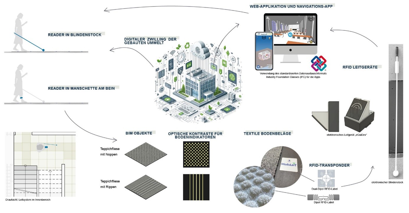 For this purpose, requirements for the guidance and information system were compiled in cooperation with visually impaired people, as well as companies from the user committee. Based on this, the floor indicators for indoor use will be developed using the tufting technology, which offers a wide range of structure and color pattern options. For a diverse range of applications, the three-dimensional textile, haptic and optical floor indicators consist of modular carpet tiles that can be sensed with a blind person’s cane. For the indoor navigation system, RFID tags will be integrated into the carpet tiles as part of an RFID system. The system will be linked via an interface with the building information model (BIM) in order to develop a navigation app for the use on mobile devices that can navigate through the building barrier-free in real time. In this context, design guidelines, requirements and tests for the practical applicability of the system will be developed. The system will be validated with a demonstrator through a practical test with visually impaired people.